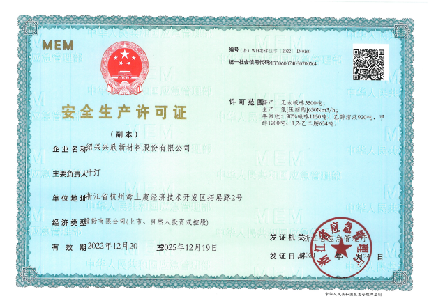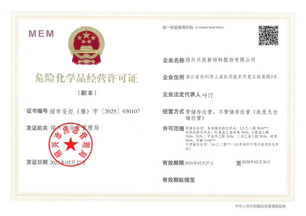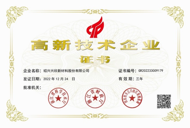 紹興興欣新材料股份有限公司成立于2002年06月27日,占地面積122畝,位于杭州灣上虞經濟技術開發(fā)區拓展路2號,現有職工200余人,專業技術人員50余人;博士、碩士研究生30余人組成的一支知識型、專業化的技術科研團隊。公司面向全球市場,專業開發(fā)電子化學品、環(huán)保化學品、醫(yī)藥中間體、高分子材料等先進新材料重點領域的省級科技型企業;建有浙江上虞、安徽東至兩個生產基地。目前為“國家高新技術企業”、浙江省“隱形冠軍”企業、浙江省專精特新中小企業;建有“省級”研究開發(fā)中心,共建天津大學浙江紹興研究院電子化學品研發(fā)中心。